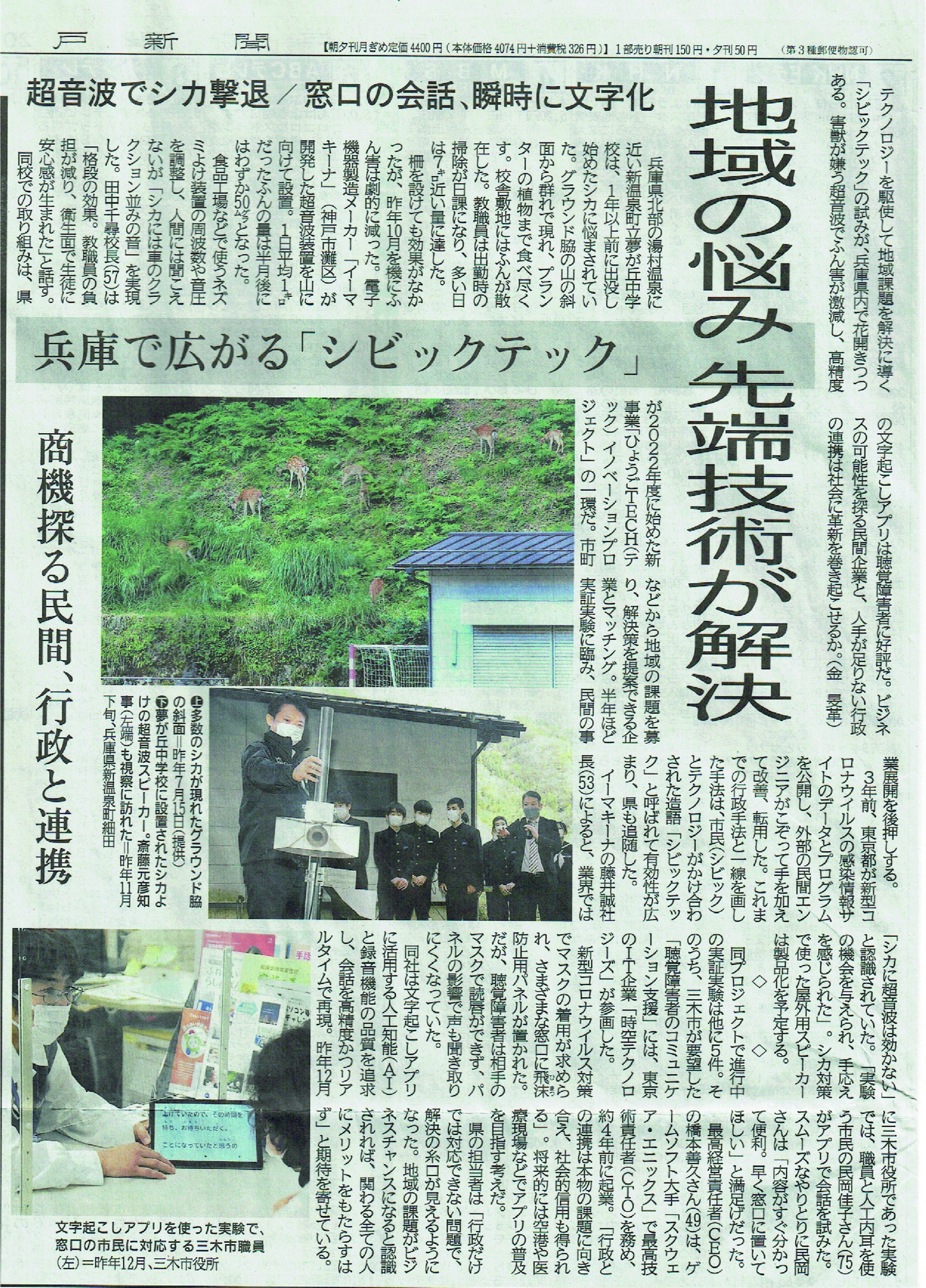 時下ますますご清祥のこととお慶び申し上げます。 平素は格別のお引き立てを賜り厚く御礼申し上げます。 市町が抱える地域課題と企業が有する技術とマッチングさせ、課題解決をめざず 『ひょうごTECHイノベーションプロジェクト』の実証実験の記事が、2023年1月6日の朝刊に掲載されましたのでお知らせ致します。